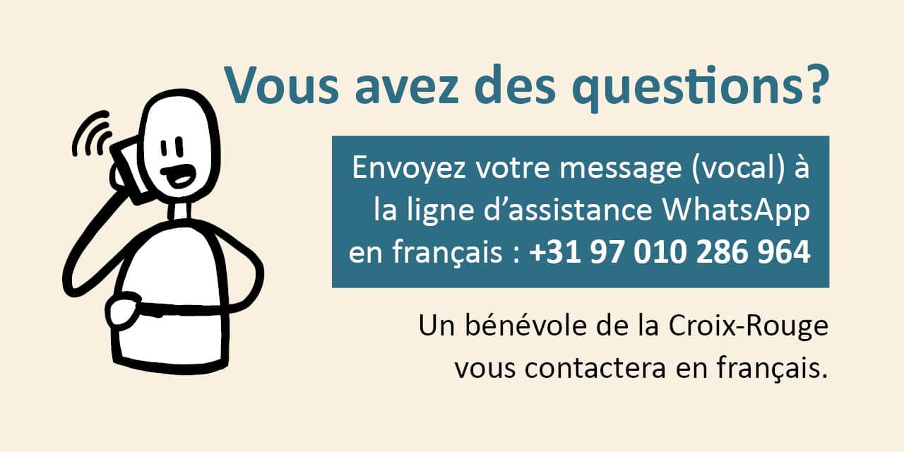 Vous avez besoin de conseils ou d’aide et vous, ou quelqu’un que vous connaissez, ne parlez pas le néerlandais ? La Croix-Rouge se fera un plaisir de vous aider dans votre langue. Envoyez votre message (vocal) au numéro +31 – 97010286964 et un volontaire de la Croix-Rouge vous recontactera.
