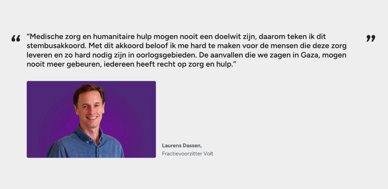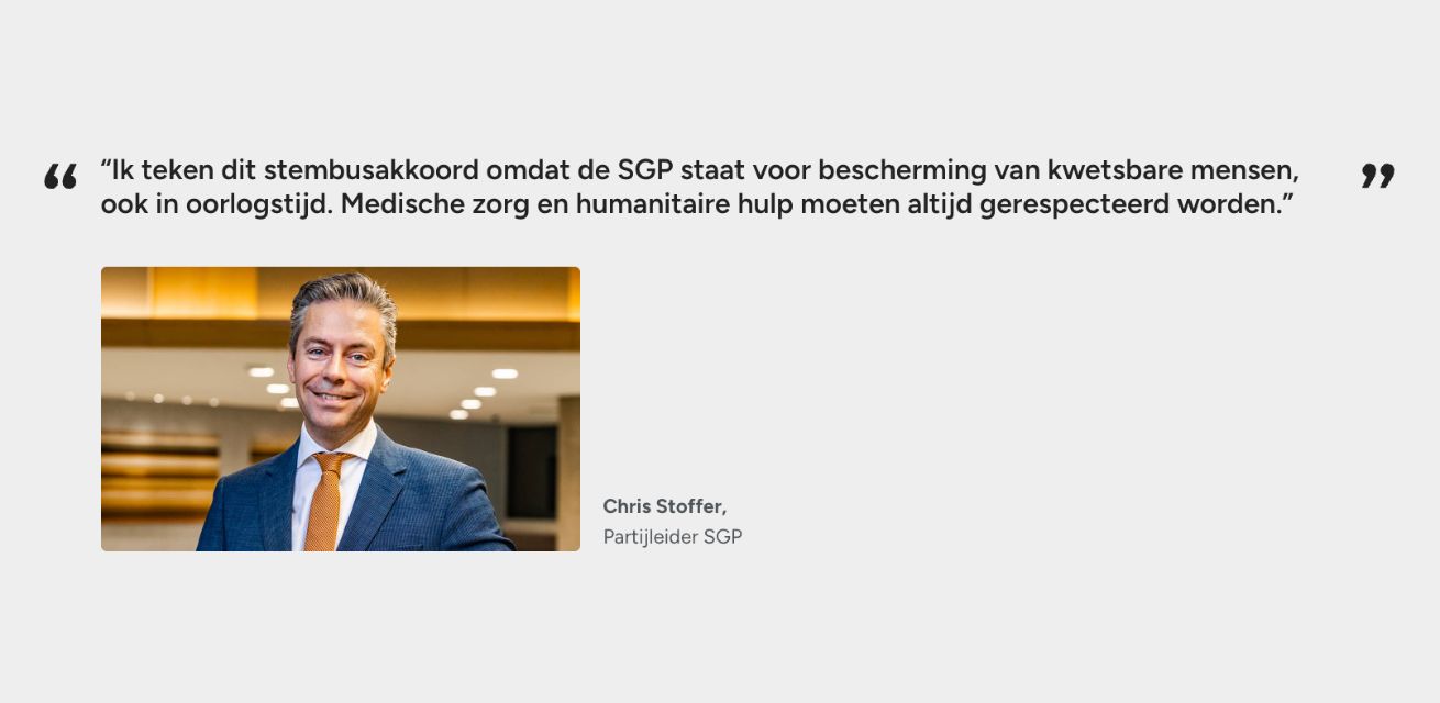 Het is nog nooit zo gevaarlijk geweest om hulpverlener te zijn. Artsen, verpleegkundigen, ambulancepersoneel en hulpverleners mogen nooit doelwit zijn, maar worden steeds vaker aangevallen of belemmerd. Tegelijkertijd wordt de toegang tot zorg voor patiënten ernstig beperkt. Ambulances worden tegengehouden, ziekenhuizen vernietigd, medicijnen zijn onbereikbaar. Met dit stembusakkoord vragen de initiatiefnemers politieke steun voor het handhaven van het humanitair oorlogsrecht én voor het garanderen van ongehinderde toegang tot medische zorg, waar ook ter wereld.