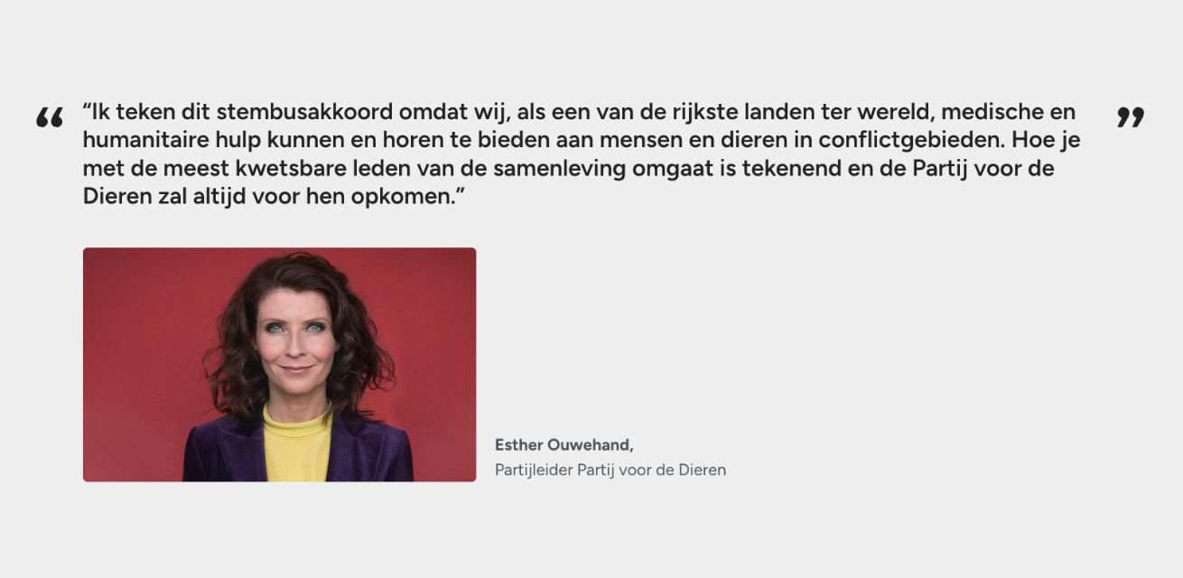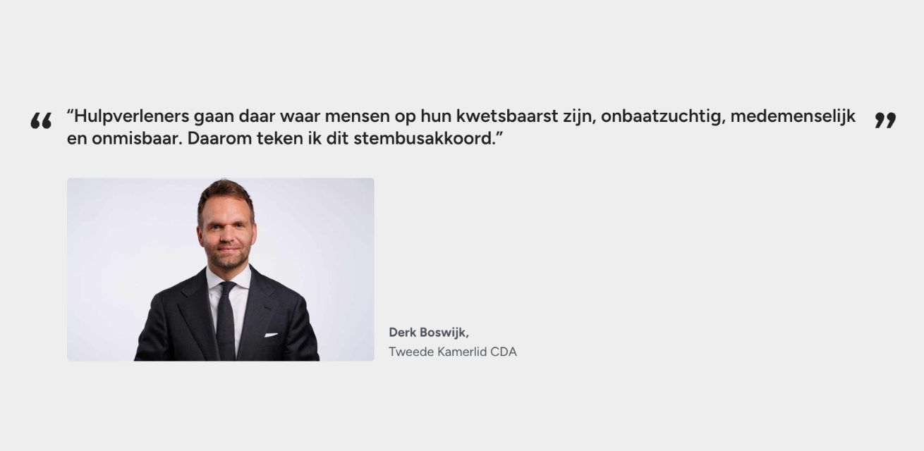 De politieke partijen die het stembusakkoord hebben ondertekend, beloven zich na de verkiezingen in te zetten voor een betere bescherming van zorgverleners. Het doel is dat Nederland een leidende rol gaat spelen in de bescherming van medische zorg en humanitaire hulp wereldwijd, door onpartijdigheid, neutraliteit en onafhankelijkheid van zorgverleners en humanitaire hulpverleners centraal te stellen in beleid.