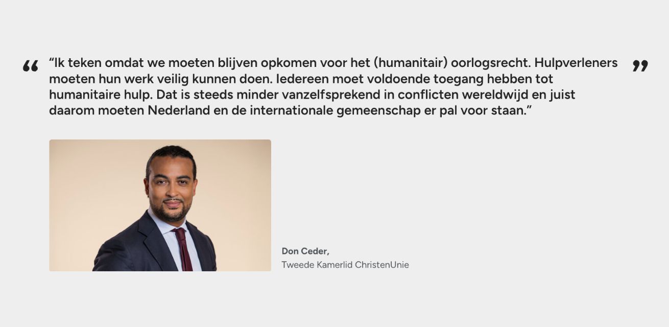 Nederland moet een leidende rol moet nemen in de toegang tot- en bescherming van medische zorg en humanitaire hulp. 2024 was het dodelijkste jaar voor hulpverleners en 2025 koerst af op een tragisch record. Om ons werk veilig te kunnen doen, hebben we de politiek nodig. Met deze handtekening zeggen politici toe om zich in een volgend kabinet onvoorwaardelijk in te zetten voor de bescherming van medische zorg en humanitaire hulp wereldwijd. Zodat zorgverleners veilig hun werk kunnen doen. Daarnaast zeggen ze toe om consequent partijen ter verantwoording te roepen die humanitaire hulp belemmeren en zorgverleners of ziekenhuizen aanvallen. Dat gebeurt volgens de initiatiefnemers nu onvoldoende.