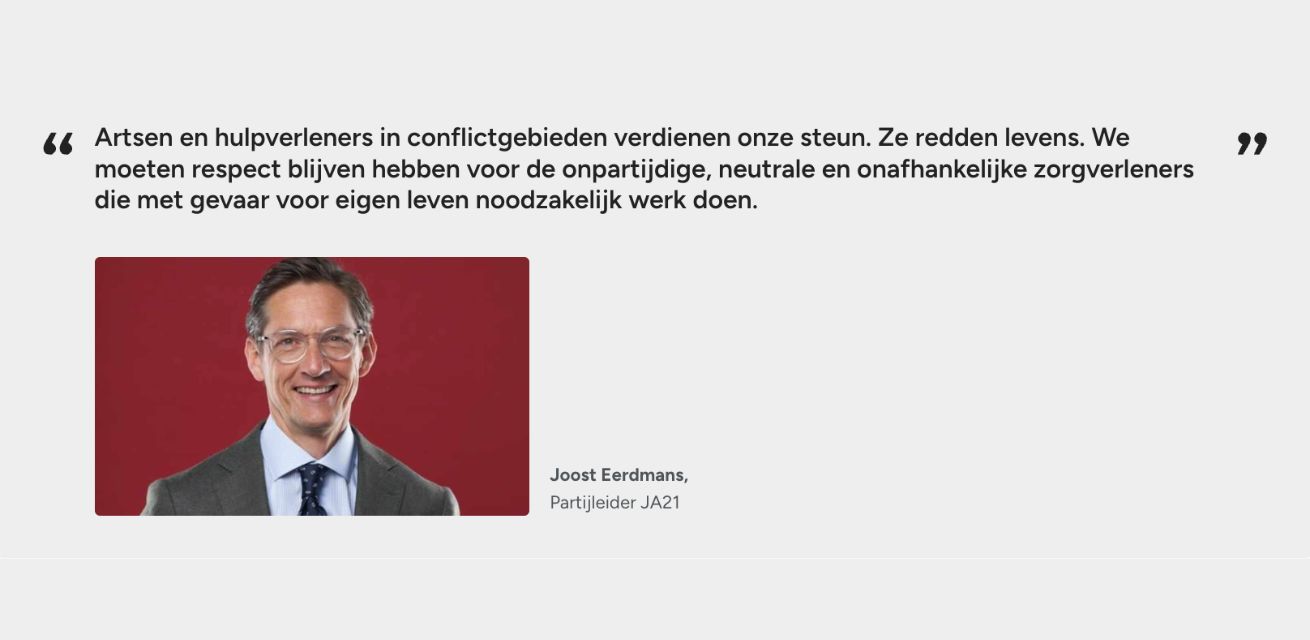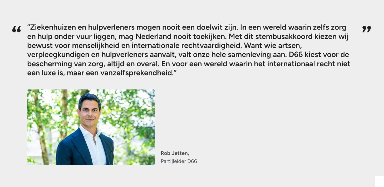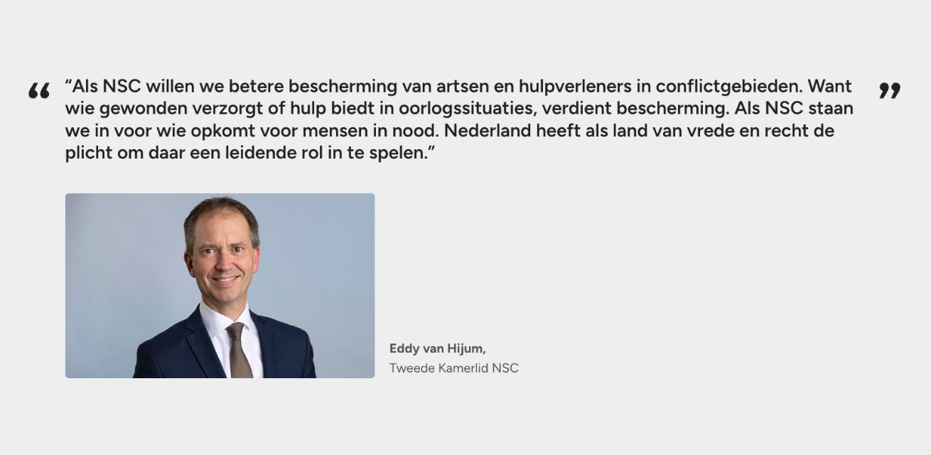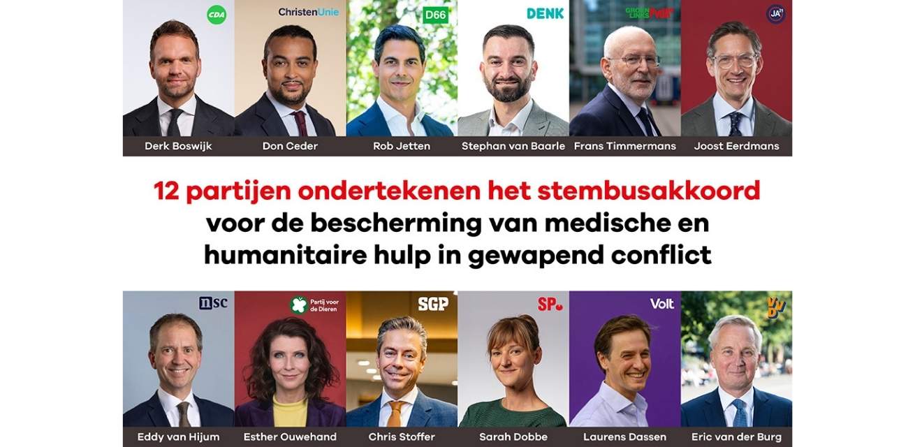 Medische zorg en humanitaire hulp in gewapende conflicten moeten beter worden beschermd. Dat vraagt ook om actie vanuit de Nederlandse politiek. Twaalf politieke partijen hebben beloofd om dit initiatief van Artsenfederatie KNMG, V&VN, het Rode Kruis en Artsen zonder Grenzen na de verkiezingen van 2025 te ondersteunen.