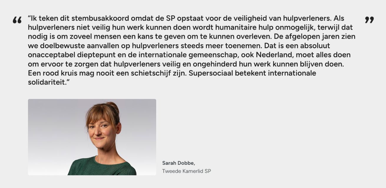 Die verantwoordelijkheden en verplichtingen zijn concreet en urgent: zorgverleners (waaronder artsen en verpleegkundigen) en humanitaire hulpverleners wereldwijd staan in de frontlinie van vele crises. Zij riskeren hun leven om dat van anderen te redden. Zij hebben politieke steun nodig. Een gezamenlijk stembusakkoord biedt politieke partijen de kans om te laten zien dat zij deze verplichtingen erkennen en daarvoor verantwoordelijkheid willen dragen.