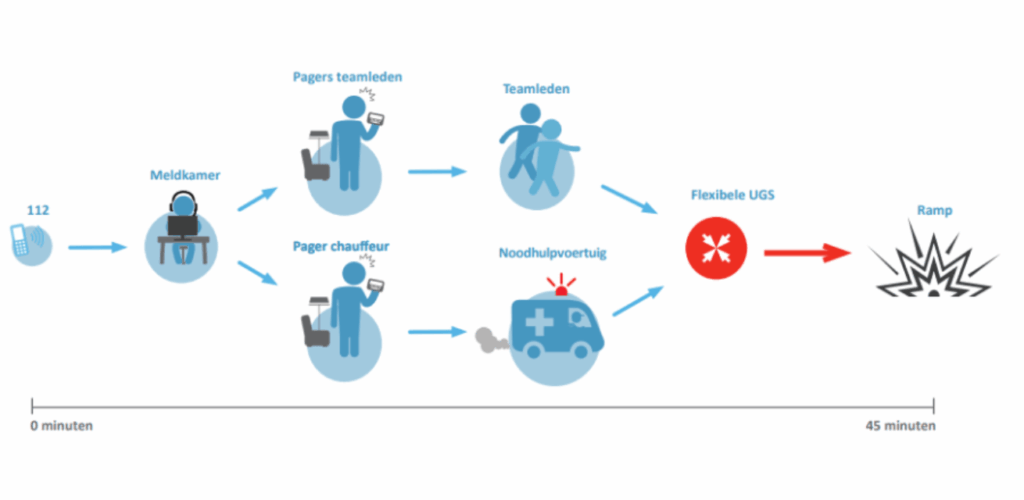 Na alarmering door de meldkamer ontmoeten de teamleden en de chauffeur met het noodhulpvoertuig elkaar bij een zogenaamde flexibele uitgangsstelling (UGS) in de buurt van het incident. Het RIVM heeft laten berekenen hoe de verspreiding van deze UGS eruit moet zien. De teams mogen rijden met optische en geluidssignalen. Hierdoor kunnen de Noodhulpteams in 95% procent van de gevallen binnen 45 minuten op de plaats van het incident zijn.