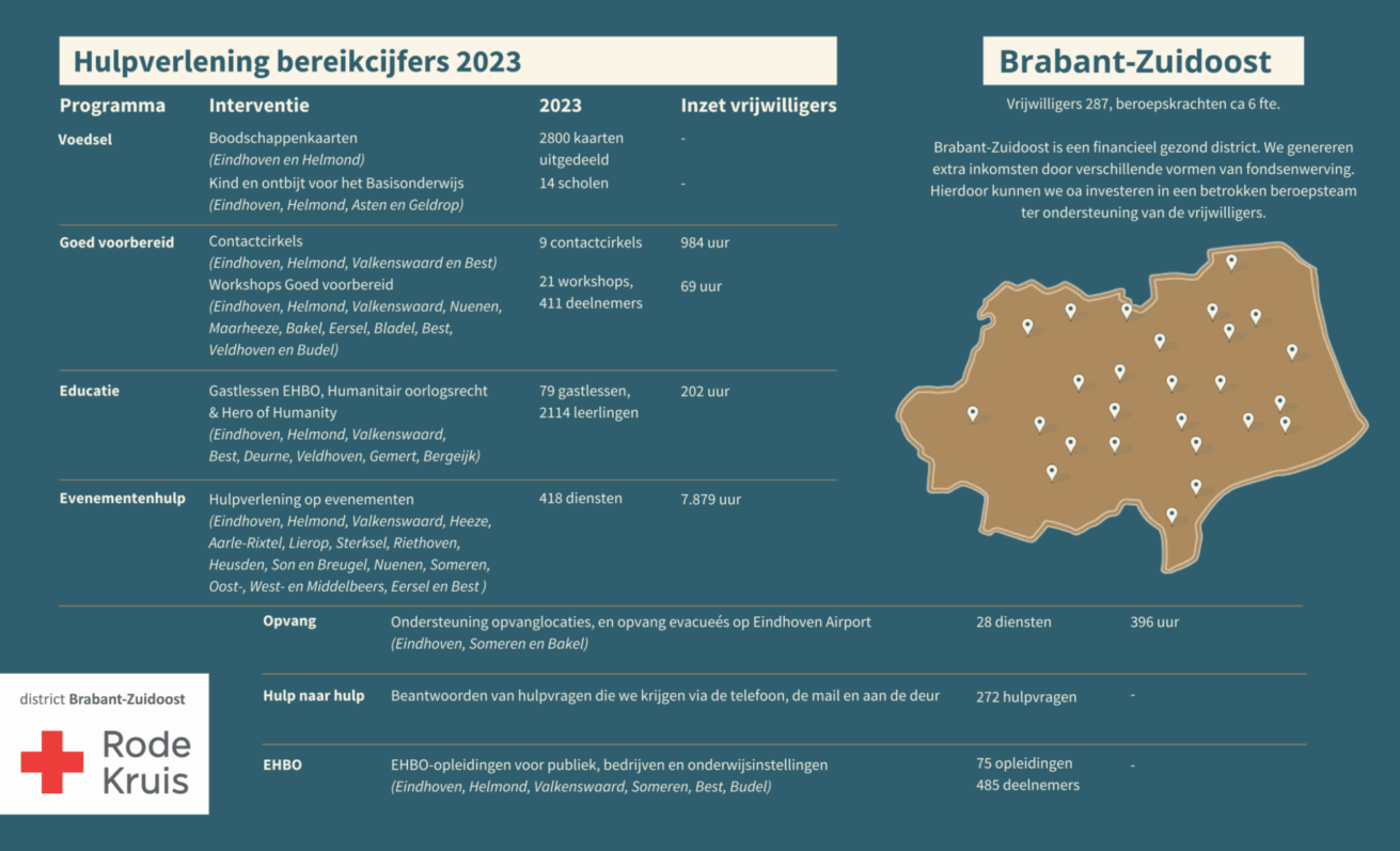 Net als van 2022 hebben we ook van 2023 een overzicht gemaakt van onze hulpverlening bereikcijfers. Wat hebben we weer veel gedaan en wat zijn we op veel plekken in Brabant-Zuidoost geweest. We hebben binnen de meeste disciplines nog meer uren hulp verleend dan in 2022 en het aantal plaatsen waar we zijn geweest zijn, is gestegen. Ook dit jaar gaan we natuurlijk weer ons best doen om in heel Brabant-Zuidoost zoveel mogelijk mensen die dat nodig hebben te helpen, want zie je het Rode Kruis, zie je hulp!