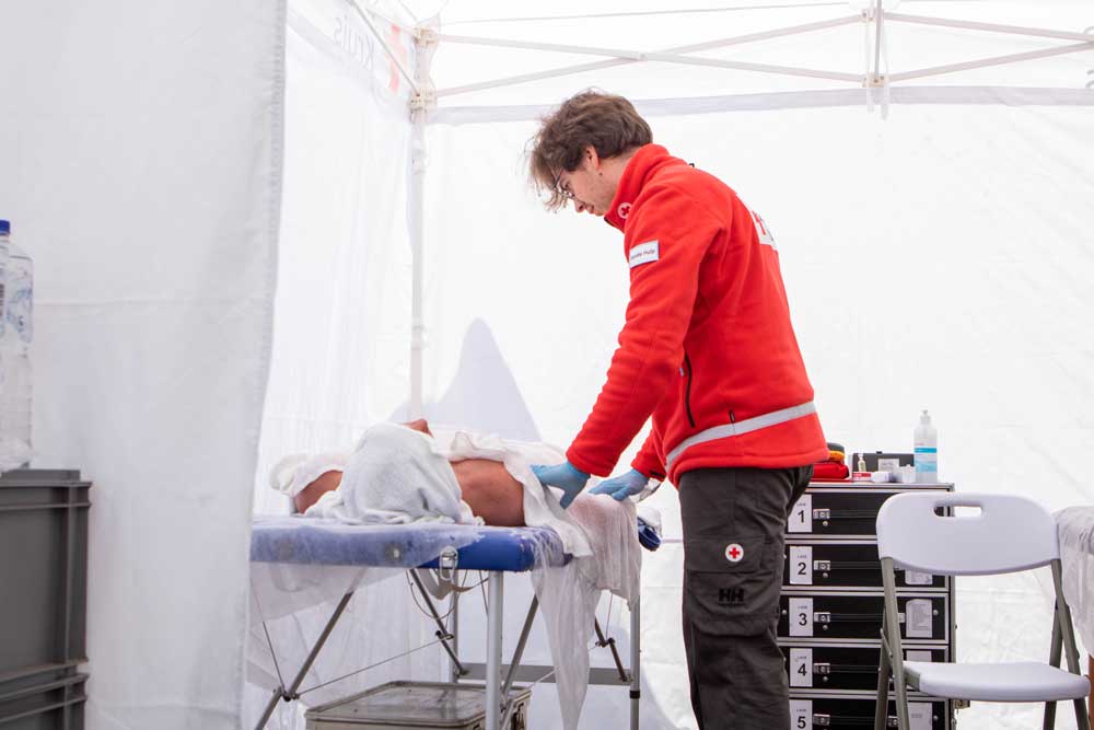 Maar rond het middaguur liepen de meldingen van hulpvragers onderweg in rap tempo op. De Rode Kruis meldkamer op het finishterrein stond in contact met alle vrijwilligers en kwam tot de conclusie dat de belasting voor de vrijwilligers groot was. Ook zij hadden te maken met de hoge temperaturen en de slachtoffers bleven maar komen. Op zo’n moment is het belangrijk dat snel geschakeld kan worden om te garanderen dat alle hulpverlening op de juiste manier kan doorgaan. Dus viel het besluit om twee Rode Kruis noodhulpteams op te roepen om bijstand te verlenen. Zij konden de hardwerkende vrijwilligers ontlasten en gelegenheid geven zelf verkoeling en rust te zoeken.