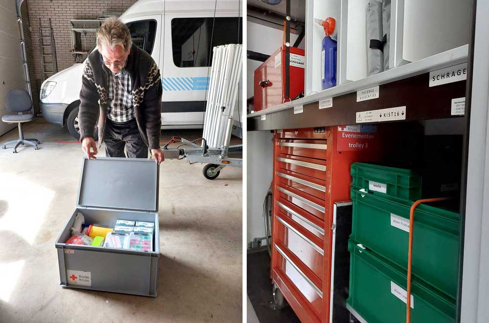 In het evenementenseizoen ben ik vooral bezig met het klaarzetten van de juiste materialen voor de verschillende evenementen waar het Rode Kruis Leiden bij aanwezig is. Dan ben ik eigenlijk iedere dag wel in de garage te vinden. Ik loop de materiaallijsten langs en check of alles er is. Het gaat dan bijvoorbeeld om spullen om een EHBO-post mee in te richten, zoals pleisters, verbanden, coolpacks, isolatiedekens, tenten, brancards en een AED. Is het evenement ’s avonds? Dan is er ook verlichting nodig. En bij koud weer gebruiken we verwarming in de tent.