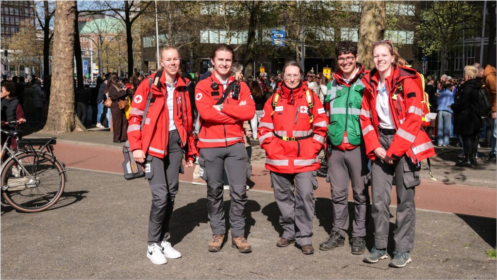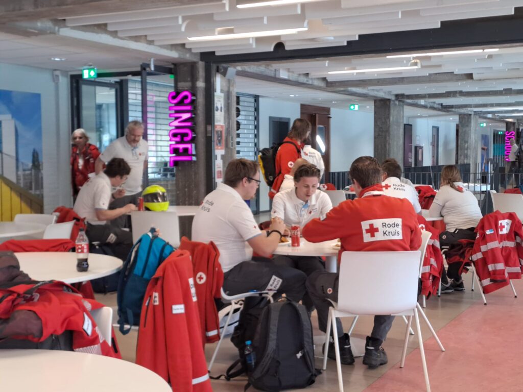 Het voorbereiden van zo’n groot evenement draait om het inzetten van een hecht, en op elkaar ingespeeld team. “Mensen die dit mogelijk maken, draaien vaak al een poosje mee.” vertelt Eric. “In de loop der jaren hebben ze veel ervaring opgedaan.” De vrijwilligers zetten zich op allerlei verschillende manieren in. Bijvoorbeeld in de eigen meldkamer van het Rode Kruis, waar alle communicatie doorkomt via het portofoonnetwerk. Denk aan verzoeken en vragen, het melden van incidenten en medische escalaties. Portofoons zijn essentieel, want het mobiele netwerk staat snel onder druk door de tienduizenden deelnemers en toeschouwers.